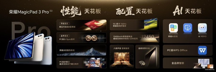 荣耀MagicPad3Pro采用8扬声器设计,升级第三代空间音频技术,让声场更加宽广立体;业界最大12450mAh青海湖电池,最高支持80W有线超级快充,告别电量焦虑;采用自研双擎天线,可实现500米WiFi超远距离覆盖。