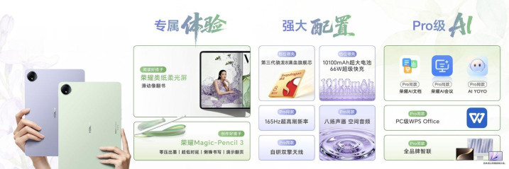 荣耀还推出了兼具轻薄高颜值的全新荣耀MagicPad312.5,并新增“放青松”、“好运紫”两款潮流配色,以及类纸柔光屏版本。荣耀MagicPad312.5搭载荣耀MagicPad3Pro同款的165Hz高刷屏、PC级WPSOffice以及Pro级AI体验。好轻、好看、好AI的荣耀MagicPad312.5,现已正式开售,消费者可于线上线下渠道选购。